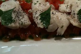 Après avoir laissé le poisson deux heures dans le réfrigérateur, ou mieux dans le freezer, coupez la moitié des filets en tranches très fines, et l’autre en noix de 2 cms de côté.