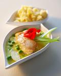 Servir une cuillère à soupe de fondue de Sbrinz AOC au fond d’une assiette creuse, ajouter la sauce bien émulsionnée, déposer les pommes de terre et les bâtonnets de céleri. Dégustez avec la lotte ou autre poisson blanc, vous pouvez servir également avec des petits pois ou févettes.