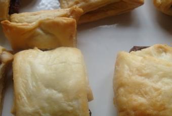 Couper chaque rectangle en 4, de la largeur des bâtons de chocolat. Déposer 1 barre de chocolat à 1.5 cm du bord supérieur de chaque rectangle. Replier la pâte sur la barre et rouler sans écraser. Placer la fermeture en dessous, et les mettre sur une feuille de cuisson. Recouvrir de film alimentaire sans trop serrer.