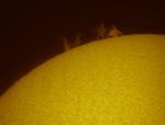 Je vous envoie encore des images du soleil toujours prises avec un PST, une caméra DMK31AF03 et une barlow 2x. La première prise le 29 mars 2008 à 15h depuis Sigoyer (Alpes de Haute Provence) montre une grande protubérance qui se détache sur le disque solaire ainsi qu’une zone active. La seconde prise le 11 février 2008 à 16h30 montre des protubérances sur le limbe.