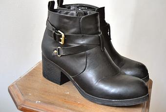 Le premier modèle est une petite bottines noires, avec deux sangles dorées et peu petit talon de disons 7cm.