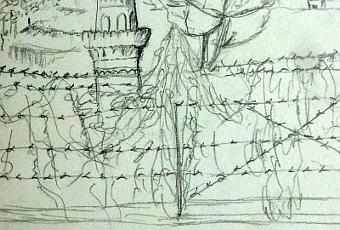 L'endroit était idéal pour dessiner, je suis restée dans la voiture, devant les fils de fer barbelés et j'ai eu le temps de tout dessiner. Pour la couleur ce sera un peu plus tard.