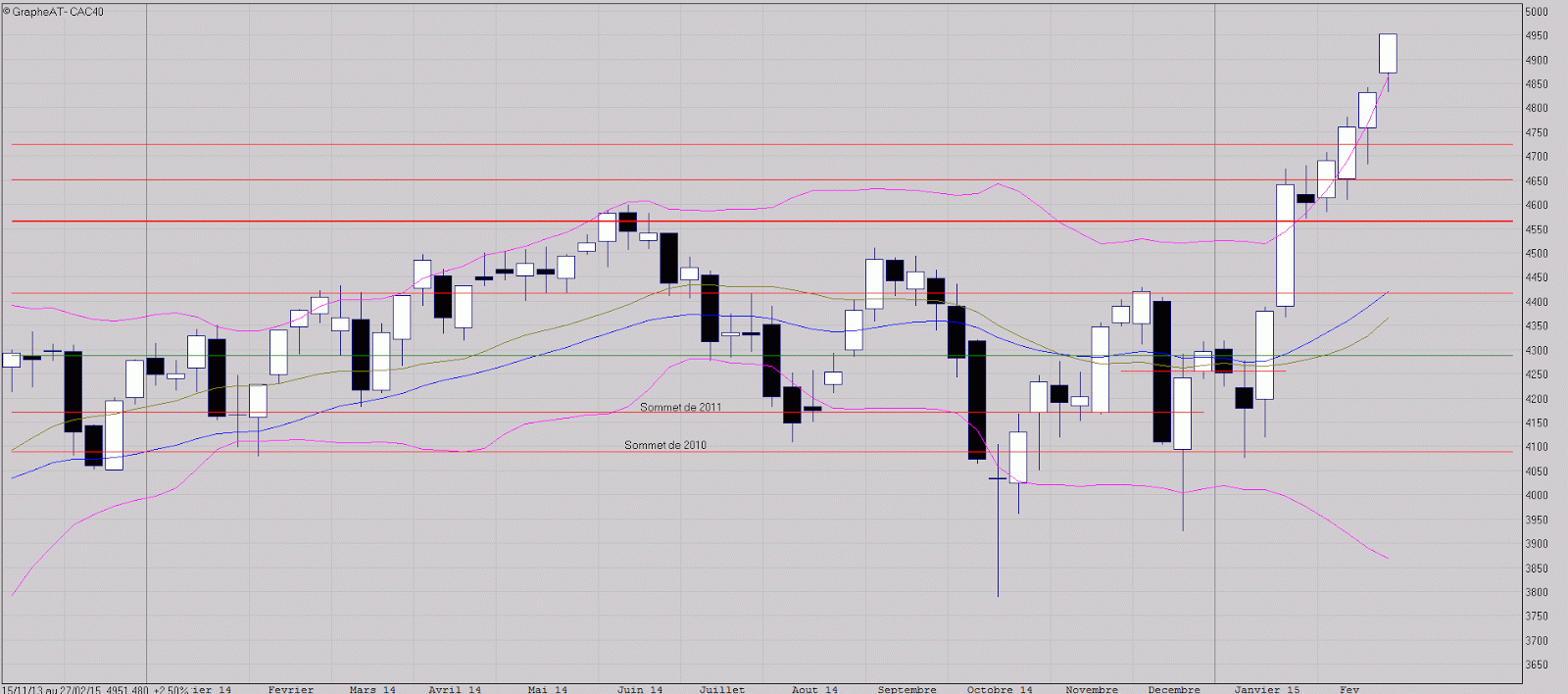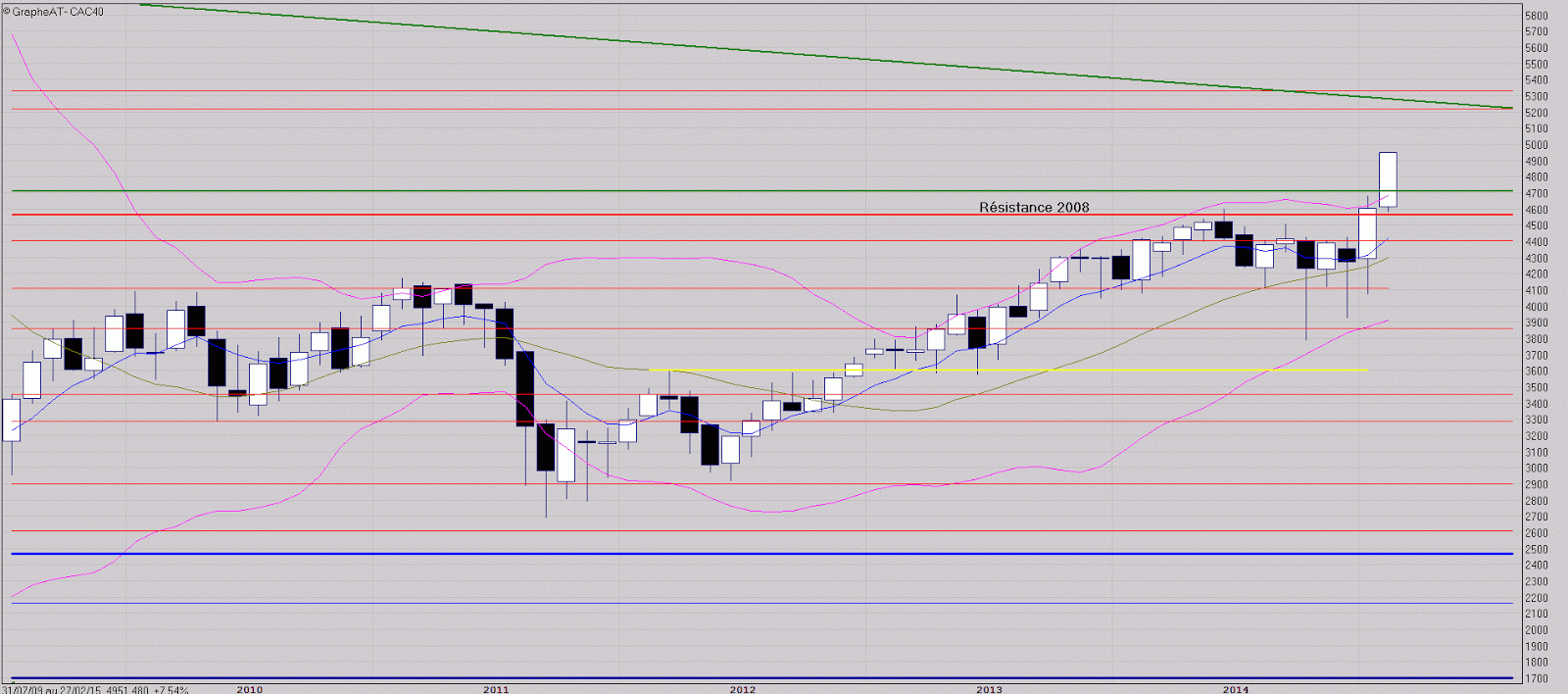 Nous avions vu, en fin de mois de janvier, que le CAC était parvenu à clôturer au-dessus de la résistance Lehmann Brothers de 2008 et validait le marteau de décembre 2014. Ce franchissement a été suivi d'une hausse très dynamique en février qui permet au CAC d'être désormais au seuil des 5000 points; ce qui n'est pas une surprise en rapport avec l'objectif long terme fixé à 5200 points, mais ce qui peut faire également penser, après 2 mois de forte hausse, à un besoin de correction avant d'atteindre cet objectif.
