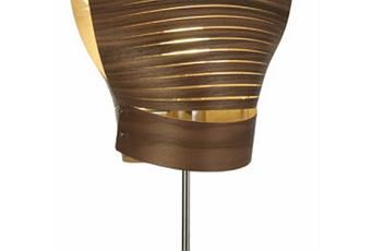 La structure externe est en placage noyer. La lampe existe aussi en echochrome miroir à l’extérieur et en cuir à l’intérieur (hauteur 40 cms). Une version lampadaire est disponible