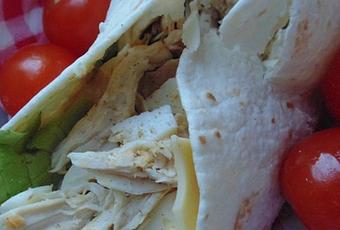 2) Poser quelques feuilles de salade sur la tortilla, ajouter le mélange au poulet. Décorer de copeaux de parmesan. Fermer la tortilla et servir bien frais