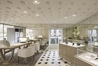 La décoration a été confiée à l’architecte Régis Botta. Régis Botta a réinterprété les styles architecturaux français. La boutique de 200m2, s’étend sur deux niveaux. L’architecte a pris soin tout particulièrement de l’éclairage pour mettre en valeur les bijoux. Les tons sont lumineux et doux. Les cadres antiques créent une ambiance élégante. Le sol est en marbre blanc poli et ses cabochons de marbre noir. Le plafond contemporain est en staff gaufré.