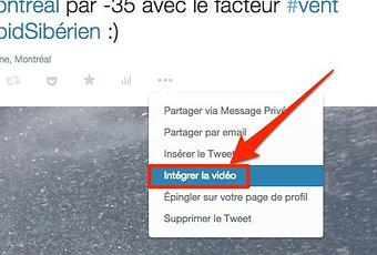 Pour intégrer une vidéo Twitter à votre site Web ou blogue, il suffit de sélectionner le bouton "Plus" qui apparaît au-dessous du tweet. Dans le menu, sélectionnez "Intégrer la vidéo". Il ne vous restera plus qu'à copier le code d'intégration. Notez que le code d'intégration est uniquement accessible depuis twitter.com