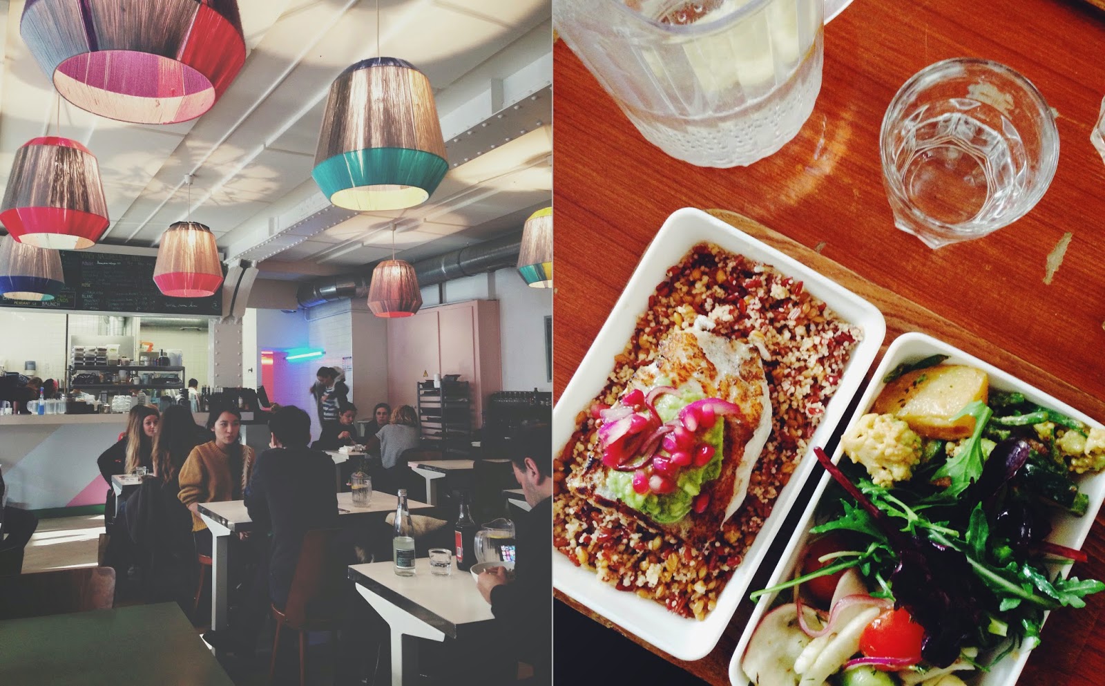 Ah le Café Marlette... L'esprit de la marque de préparations pour pains et pâtisseries bioincarné dans un café chaleureux, élégant et de bon goût. J'avais déjà testé le brunch en avril dernier, très copieux, hyper coloré et bien équilibré, avec de beauxproduits comme du jambon Prince de Paris et des fromages Beillevaire. Là je me suis laissée tenter par un petit-déjeuner pioché au hasard de la carte : granola maison (oui je suis vraiment addict), une part de carrot cake, un jus pressé et un café latte. L'endroit par excellence à avoir en bas de chez soi - on s'y sent d'ailleurs presque comme chez soi.Café Marlette, 51 rue des Martyrs, Paris 9"Bob's Kitchen" : la cantine healthy par excellenceLa clientèle est internationale, jeune et branchée. Cageots de fruits et légumes : check. Des thermos de thé sont à disposition sur les grandes tables communes qui ne désemplissent pas. On trouve une petite place et on déguste son veggie stew dans une gamelle en émail (riz, légumes, crudités, sauce au choix). Mention spéciale ce jour-là pour la soupe de black beans et ses petits croutons délicieux, une tuerie. On a testé le "Cold press", un jus pressé à froid à base de chou kale, spiruline et chlorelle, agrémenté de concombre, fenouil, pomme, citron, gingembre, persil et céleri. Non seulement c'est sain, mais c'est bon !Bob's Kitchen, 74 rue des Gravilliers, Paris 3Le Richer au déjeuner