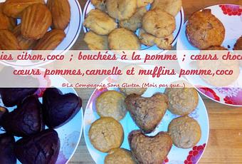 Cookies citron/coco, bouchées à la pomme, cœurs chocolat, cœurs pommes/cannelle et muffins pomme/coco