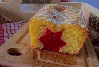 Lorsque le cake à la fraise à refroidi, coupez des tranches assez épaisses (3cm). A l'aide d'un emporte pièce de la forme choisie, découpez vos formes dans chaque tranches. Mon étoile était assez petite, j'ai pu en découper 2 dans chaque tranche. Disposez toutes les étoiles côte à côte et colle entre elles, sur la pâte qui est déjà disposée dans le moule. (laissez 2cm sans étoile à chaque extrémité du gâteau).Versez délicatement le reste de la préparation à la vanille. On ne doit plus voir les étoiles rouge, tout est recouvert. Enfournez pour 30 minutes.