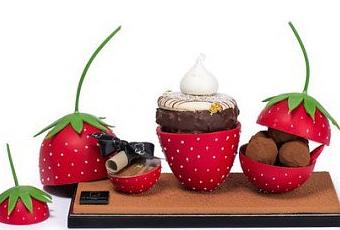 Ces trois « oeufs » n’ont que l’apparence de la fraise. Les trois créations sont en chocolat et prédécoupées en deux. Le socle se déguste également puisqu’il s’agit d’un tablette en chocolat noir aux noisettes du Piémont.