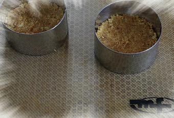 Réduire les hobnobs en poudre, ajouter le beurre fondu, bien mélanger et mettre dans 4 cercles de 8cm de diamètre.