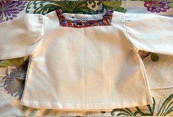 Je continue dans le style classique d’Astrid Le Provost en choisissant le modèle avec encolure rectangulaire et fine parementure appliquée. L’étoffe est un piqué de coton très fin conçu pour les chemises d’hommes et l’encolure est en Liberty au motif "cars".