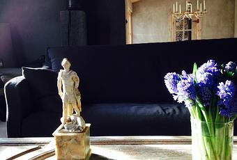 Un albâtre de Malines XVIIe posé sur une table basse, créée par Franck Delmarcelle, se réchauffe aux rayons du soleil qui traversent la pièce de cette maison de campagne.albâtre de Malines