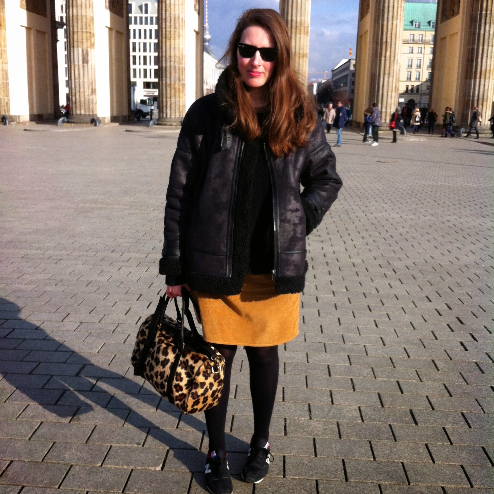 J'aime bien associer cette petite jupette moutarde en velours côtelé à du noir tout en faisant écho à mon sac léopard. C'est une façon subtile de venir un peu "pimper" une tenue sombre.