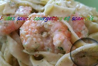 Servir aussitôt les pâtes nappées de sauce courgettes, de rondelles de courgettes, de rondelles de chorizo, de scampis et de parmesan.
