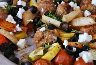 PRÉPARATION1. Dans un petit bol, mélanger l'huile, le vinaigre et l'origan séché. Saler et poivrer.2. Mettre les pommes de terre en une seule couche sur une plaque de cuisson tapissée de papier-parchemin. Verser la moitié de la vinaigrette et mélanger pour bien enrober. Cuire au four préchauffé à 400°F (200°C) pendant environ 20 minutes ou jusqu'à ce que les pommes de terre aient légèrement ramolli, les retourner et réserver.3. Entre-temps, mélanger l'agneau, l'ail, l'échalote, la chapelure, l'œuf et la moitié de la menthe. Saler et poivrer. En utilisant 1 c. à tab (15 ml) à la fois, façonner la préparation en 16 boulettes. Déposer les boulettes sur la plaque avec les pommes de terre réservées.4. Mettre les courgettes et les tomates sur une autre plaque de cuisson tapissée de papier-parchemin. Arroser du reste de la vinaigrette et mélanger. Mettre les deux plaques au four et poursuivre la cuisson de 20 à 25 minutes ou jusqu'à ce que les boulettes aient perdu leur teinte rosée à l'intérieur (intervertir les plaques à la mi-cuisson).5. Au moment de servir, mettre les légumes sur la plaque avec les boulettes. Garnir du fromage feta, des olives noires et du reste de la menthe.