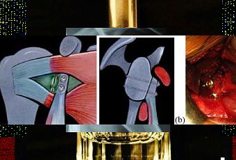 Ce tendon conjoint vient cravater la partie inférieure du tendon du sous-scapulaire réalisant un effet hamac. La butée osseuse est ainsi positionnée au niveau de la zone de décollement capsulopériosté et peut même combler un éventuel défect osseux glénoïdien. La fixation s’effectue le plus souvent avec deux vis (Fig. 2), une suture capsulaire avec le moignon du ligament coraco-acromial sur le bord latéral de la butée complète alors un triple verrouillage osseux, musculaire et capsulaire.