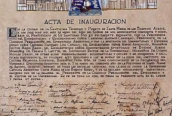 (1) Avec des fautes de frappe, sans doute dues à un scanner suivi d'une lecture OCR : estimarlo (au lieu de estimado) et cat6lica (au lieu de católica). (2) Sur les grandes dates historiques, voyez le Vademecum historique qui se trouve dans la partie médiane de la Colonne de droite. (3) Curieusement, ces dates sont aussi celles d'un haut lieu du tango au début du XXème siècle. Un lieu de plaisir et de divertissement de la haute société, celle-là même qui, au-delà de ses frasques, soutenait de ses fonds l'université confessionnelle. El Armenonville, un restaurant où Carlos Gardel lança sa carrière en 1913 en duo avec José Razzano et où il créa Mi noche triste, le premier tango qu'il ait jamais chanté à la fin de l'année 1916... (4) Ce courant théologique a ensuite connu différentes dérives temporelles qui ont conduit à la condamnation de l'ensemble par Jean-Paul II. Depuis l'élection du Pape François, un certain nombre de travaux, fidèles à l'enseignement du concile Vatican II, sont remis à l'honneur parce qu'ils correspondent à un besoin pastoral de l'Eglise en Amérique du Sud, dans les circonstances socio-économiques qui sont les siennes. (5) Eduardo Pironio (1920-1998) a été déclaré Vénérable Serviteur de Dieu. Son procès en béatification est en cours, très soutenu par l'archidiocèse de Mar del Plata et par le diocèse de Mercedes-Luján. Il a en effet été l'un des grands architectes du développement des pèlerinages mariaux vers la Virgen Gaucha,comme on l'appelle dans la Province de Buenos Aires. C'est aussi une personnalité qui a fortement marqué l'actuel Pape dans son parcours ecclésial. Il est enterré dans la basilique de Notre-Dame de Luján.