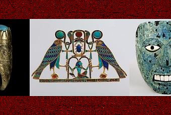 Exemples de bijoux antiques utilisant la turquoise, à gauche, une bague perse en or, au centre un pectoral égyptien incrusté de turquoise et à droite un masque en bois aztèque incrusté de turquoises naturelles. Vous découvrirez plus de bijoux perses de turquoise sur cette page.