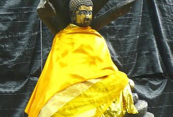 Dans un océan de bâches plastiques noires, dans une architecture de tubulures rouillées, un bouddha impassible trône.