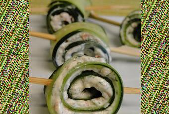 Et c’est parti : sur chaque bande de concombre, mettre une cuillère à café (environ) du mélange et rouler serré, faire tenir avec un pique en bois.