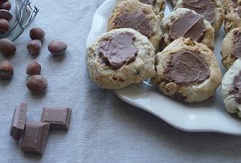 Dès la sortie du four, disposer un petit carré de pralinoise au centre de chaque biscuit. Laisser ainsi une ou deux minutes, (j'ai replacé mes plaques dans le four chaud mais éteint) le temps de laisser le temps au chocolat de fondre, puis, avec le dos d'une cuillère, ajuster le chocolat au centre du cookie.