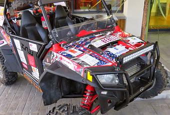 Pour info, il s'agit d'un quad de marque Polaris, modèle RZR 900, 4 roues motrices.C'est une machine spécialement conçue pour le raid, réputée pour sa solidité, sa puissance et son endurance. Elle a du être modifiée pour permettre d'embarquer le matériel nécessaire (tente, réserve d'eau et de carburant, roue de secours) et assurer un meilleur refroidissement du moteur. Cette préparation a été confiée à Christophe Agar, un préparateur toulousain.