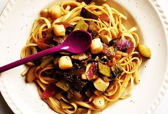 Servez les linguine dans des assiettes creuses puis nappez généreusement de légumes et parsemez tout aussi généreusement de noix de Saint-Jacques.