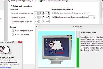 Workrave est un logiciel libre et gratuit qui aide à la prévention et à la récupération des troubles musculosquelettiques. Le programme surveille votre utilisation du clavier et de la souris. A partir de ces informations, il vous rappelle fréquemment de prendre des pauses, et vous impose une limite quotidienne. Il suggère aussi des exercices physiques.