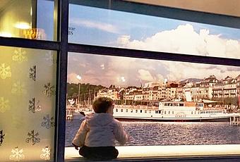 Trêve de plaisanterie, ce bout de chou n’est pas à vendre. Et même s’il est en vitrine malgré lui ce n’est pas pour amuser la galerie. Ses parents sont occupés à passer des transactions sur le Multimat de l’UBS au centre commercial Coop 2000 à Villereuse aux Eaux-Vives mardi 18 mars 2015 à 19h00. Eloignant leur rejeton des petits tracas matériels père et mère ont trouvé en cette vitrine le moyen idéal pour avoir les 4 mains libres devant l’ordinateur bancaire, grand ordonnateur pour les petites opérations du quotidien. Le petit est resté rêveur devant le grand poster du bateau Genève, ancien fleuron de la flotte du Léman qui ne navigue plus mais qui procure via une association à caractère social et reconnue d’utilité publique du soutien aux nombreux démunis qu’abrite la riche et opulente Genève, l’internationale. De deux choses l’une ou bien notre bébé du jour aura à sa majorité le pied marin ou plongera dans le domaine associatif et pourquoi pas bancaire...pour faire honneur à la place financière qu’occupe la Genève des affaires.