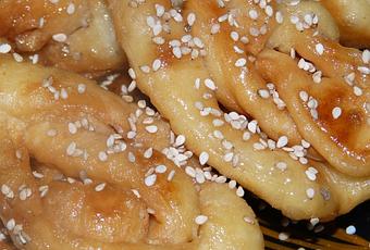 Faire frire dans de l'huile chaude à la façon de beignets, égouttez puis trempez dans le miel réchauffé, parsemez de grains de sésame grillés.