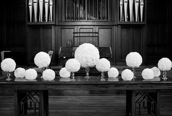 Des boules de fleurs blanches de toutes tailles seront très jolies comme décoration de table d’entrée.