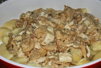 1 fruit à pain 250gr de farine 2 oeufs sel & poivre Sauce champignons 3 filets de poisson 2 oignons3 gousses d'ail 2 dl de lait fermenté poivre et sel Faire revenir les oignons émincés avec un filet d'huile d'olive. Ajouter les champignons en morceaux et laisser cuire à feux fort pendant 3 minutes. Saler et poivrer. Ajouter le lait fermenté, mijoter 5 minutes.