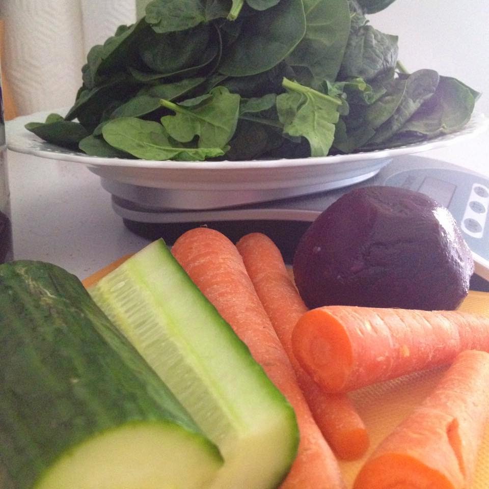 Jus au 5 légumes2 branches de céleri2 carottes2 betteraves pelées et cuites2 tasses d'épinard ou de choux frisés1/4 de concombre ou 1/2 tomate
