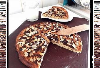 350 g de farine, 1 sachet de levure de boulanger, 1 càc de sucre en poudre, 3 càs d'huile d'olive, 1 tablette de chocolat noir , 120 g d'amande effilées, 1 càc de sel et 4 bananes, 1 filet de jus de citron