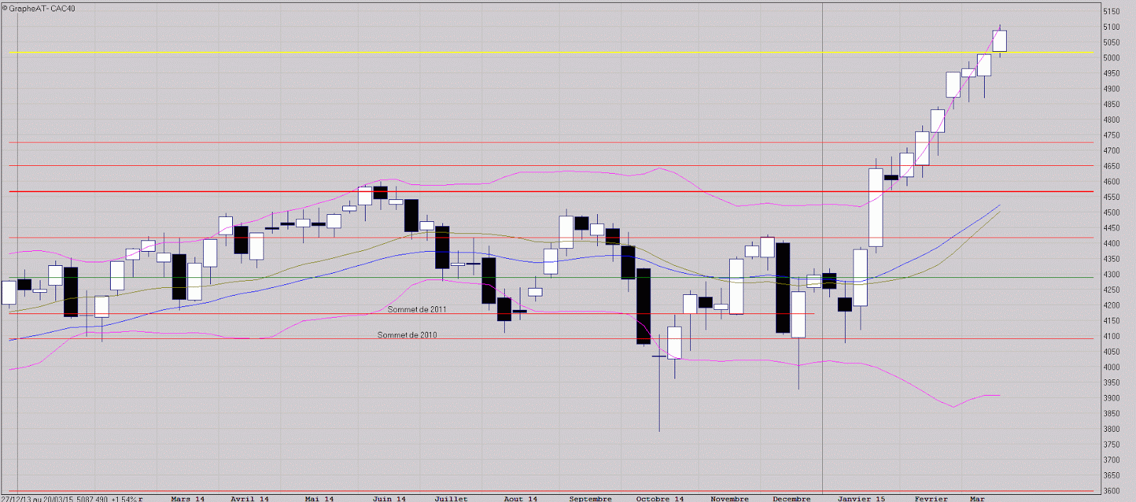Le graphe des bougies quotidienne montre que le support des 5027 points a contenu la tentative baissière de cette séance.