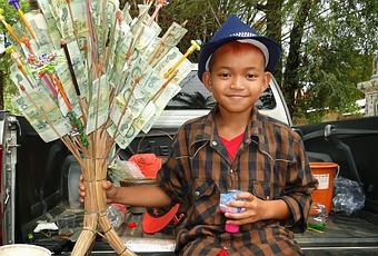 Mais aussi pour la 1° fois, l'occasion de me faire traiter de radin. ExplicationsVoyant une grande famille en pose somthan dans le parcJe me suis approché e,t dans un pick-up, un arbre a billets a destination du wat. Voulant contribuer avec un billet de 20 bahtsLe "gardien" de l'arbre m'a dit:"""Hé farang, fait pas le radin, met au moins 2 billets"""Exécution dans la bonne humeur et éclats de rire généralLe gamin s'est quand même fait sermonné par la maman.....