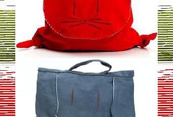 Velours côtelé bleu ou vert pour Doggy ; rouge ou jaune pour Kitty. Lavage : 30°. Bretelles réglables et poignée pour être portés à la main. Poche intérieure.
