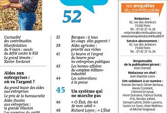Assistanat, syndicats, fraudes sociales, hauts fonctionnaires, aides publiques aux entreprises… Tous les deux mois, Les Enquêtes du contribuable approfondissent dans des dossiers de fond un thème majeur de l’actualité économique et sociale. Revue de référence en matière d’argent public, Les Enquêtes du contribuable vous permettent d’être réellement informé des dérives grandissantes et cachées que connaît notre pays. Ce magazine de conviction est indépendant de tout lobby et porte un regard différent sur l’actualité qu’il analyse du point de vue des contribuables.3,50€. Abonnement : 6 numéros par an pour 21 € seulement !