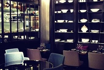 Ce qui m'a moi épaté, à peine arrivée sur place, c'est la décoration très élégante, chic et contemporaine : un écrin de velours noir, des murs habillés d'étagères sur lesquelles trône de la vaisselle blanche (soupières, assiettes, cloches et autres curiosités), les tables laquées noires sont espacées et placées sous des abats-jours immenses et dorés, des fauteuils ou banquettes au velours bleu turquoise donnent envie de s'allonger.