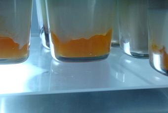 2 Mélangez le yaourt et les petit suisses avec un peu de lait, jusqu,a ce que la préparation soit homogéne. Ajoutez le reste de lait et mélangez a nouveau. Versez délicatement dans les pots.
