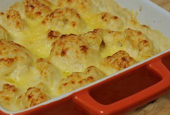 - Beurrer un plat à gratin. Disposer les bouquet de chou-fleur. Arroser de sauce, parsemer de l'emmental et ajouter le reste du beurre en petites noisettes sur le dessus. Saler et poivrer.