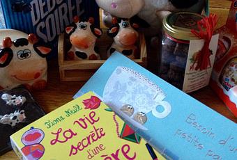 Il y a des vaches. Et des vaches. Et encore deux ou trois vaches. Bref, j’étais ravie. Sans compter les petits trucs sympathiques au chocolat (noisettes enrobées de chocolat et piment d’espelette. C’est très bon). Les enfants ont englouti les œufs Kinder en 12 secondes 37, montre en main. Je n’ai pas encore lu le livre mais je n’en pense que du bien, a priori. Rien que le titre fait plaisir à voir. Il y avait même une peluche vache qui fait meuh pour Toddler 5. Vu son état, j’ai accepté de bonne grâce de la lui prêter.
