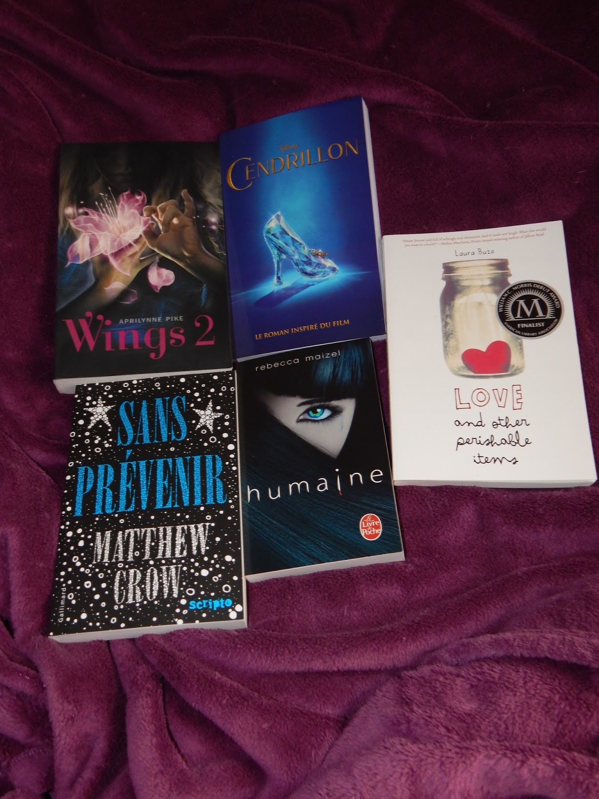 Sans Prévenir de Matthew Crow Wings, tome 2 : Sortilèges de Aprilynne Pike Cendrillon de Brittany Candau Humaine, tome 1 de Rebecca Maizel Love and Other Perishable Items de Laura Buzo [Vo]Voilà, de beaus livres qui vont venir s'ajouter sur ma Tour de Pize lol.Merci à tous !!!!Bonne soirée.