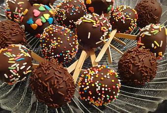 3 - Former des boulettes. Bien enfoncer les bâtonnets dans les boulettes et les disposer sur une assiette couverte de papier parchemin. Les réfrigérer quelques minutes pour qu’elles durcissent un peu. / Shape the dough into small balls. Push the sticks into the cake balls and place them on a plate covered with parchment paper. Let them harden for few minutes, in the refrigerator. / Hacer bolitas. Pinchar los palitos en las bolitas y colocarlas en un plato cubierto de papel vegetal. Ponerlas en la nevera unos minutos para que se endurezcan un poco.
