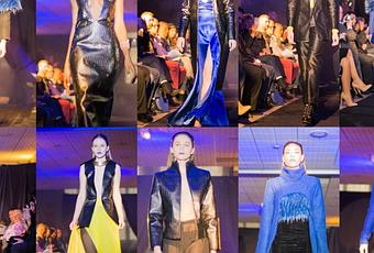 Pour le maquillage, les bouches des mannequins s’habillent d’un bleu vif et les cheveux sont plaqués en arrière pour apporter une touche sophistiquée à l’ensemble.