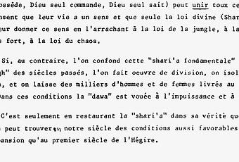 Elle empêche des milliers de gens de voir que dans la nouvelle "Jahiliya" de la civilisation occidentale décadente, la véritable "shari'a" (Dieu seul possède, Dieu seul commande, Dieu seul sait) peut unir toux ceux qui pensent que leur vie a un sens et que seule la loi divine (Shari'a) peut leur donner ce sens en l'arrachant â la loi de la jungle, à la loi du plus fort, â la loi du chaos.Si, au contraire, l'on confond cette "shari'a fondamentale" avec le "fiqh" des siècles passés, l'on fait oeuvre de division, on isole l'islam, et on laisse des milliers d'hommes et de femmes livrés au désespoir. Dans ces conditions la "dawa" est vouée â l'impuissance et à l'échec.C'est seulement en restaurant la "shari'a" dans sa vérité que l'islam peut trouver en notre siècle des conditions aussi favorables à son expansion qu'au premier siècle de l'Hégire.