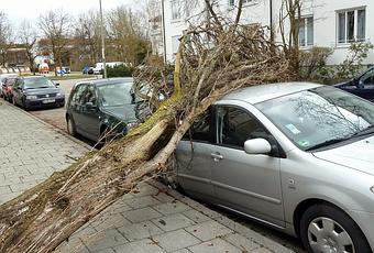 Une perturbation circule rapidement sur tout le pays, portée par un fort vent d'ouest. Les vents violents jusquà 110 Kmh (jusqu´à 11 Beaufort) soufflent en tempête et déracinent des arbres, comme ici à München Neuhausen où la chute d´un arbre a défoncé trois voitures.