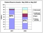 La FED à pour le moment utilisée presque la moitié de son bilan dans son effort de sauvetage. Elle à accepter toutes sortes de valeur mobilière dont les flux sont basés sur des portefeuilles d'emprunts immobiliers ou automobiles, de paiements de cartes bancaires, de créances commerciales et les a échangées contre ses propres Bon du trésor US. Les banques se retrouvent donc avec des actifs stables et relativement surs ou du moins qui valent encore quelques chose. En revanche, la FED se retrouve avec des produits hybrides à haut risque dont la valeur est très difficile à déterminer. Dans ce processus le pourcentage de bon du trésor dans son bilan est passé de 92% à 57% en un an (voir graphe ci-dessous).